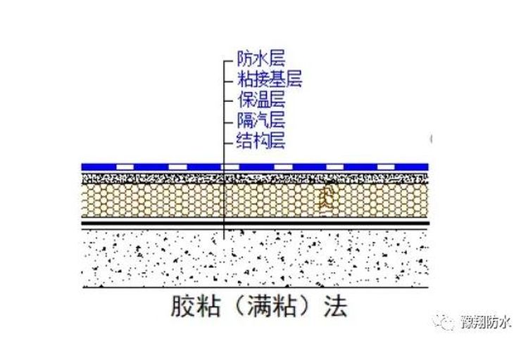 粘接法不難理解,施工時(shí)在卷材及基面上涂刷膠粘劑,通過(guò)膠粘劑將卷材粘接固定與基面之上。此施工方法常用于一些混凝土結(jié)構(gòu)層的防水施工。粘接法可分為滿粘法,條粘法、點(diǎn)粘法則是在局部條形、點(diǎn)狀區(qū)域涂刷膠粘劑來(lái)進(jìn)行卷材的粘接施工;